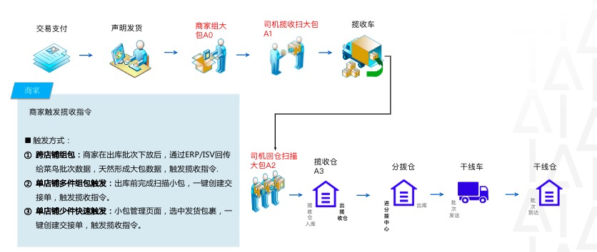 After creating the logistics order, the merchant will form a large package of the same small package data of the collection warehouse (such as Yanwenyiwu warehouse, Sifang Shenzhen warehouse, etc.), and paste these small packages into the same large package and paste a large package noodle sheet to the driver. The driver scanned the large form to record the Internet time.