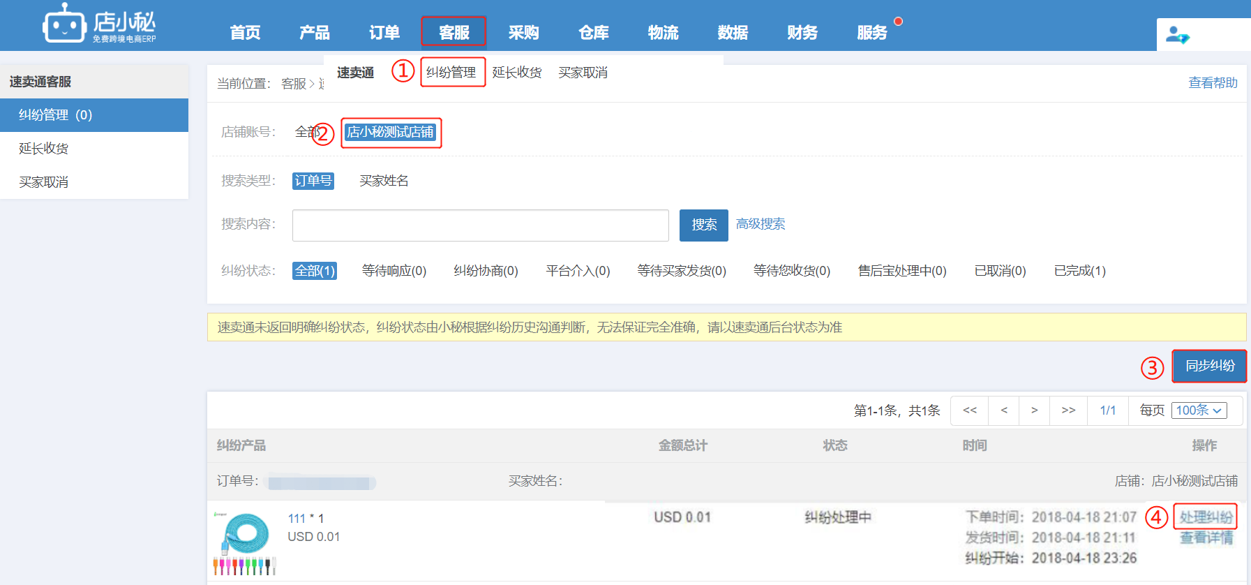 first step: [Customer Service—Dispute Management—Select Store—Synchronize Dispute—Handle Dispute]