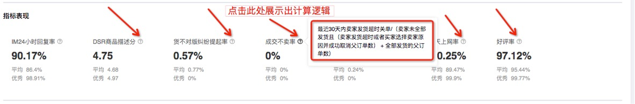 Antwoord: Voor de berekeningslogica van gerelateerde evaluatie-indicatoren kunnen handelaren inloggen op de backstage van de handelaar>>winkel>>winkelprestaties>> subquery verkopersservice en op de grijze markering naast elke indicator klikken, zoals weergegeven in de afbeelding: