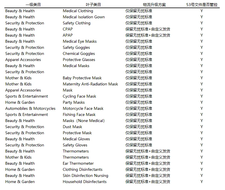 3. Due to the special restrictions on customs and logistics in various countries during the epidemic, the platform will offline economical, simple and customized logistics lines for 29 categories, that is, epidemic-related categories can only be shipped through AliExpress worry-free logistics-standard lines during the overseas epidemic, some of which are liquid, The sensitive goods with tape still retain the permission to customize the category. Please adjust the logistics freight template under the corresponding category before the line is offline. The estimated effective time is May 6, 2020, Beijing time. It is recommended that the merchant pay attention to the background in time. Please refer to the following table for relevant categories and line closure plans: