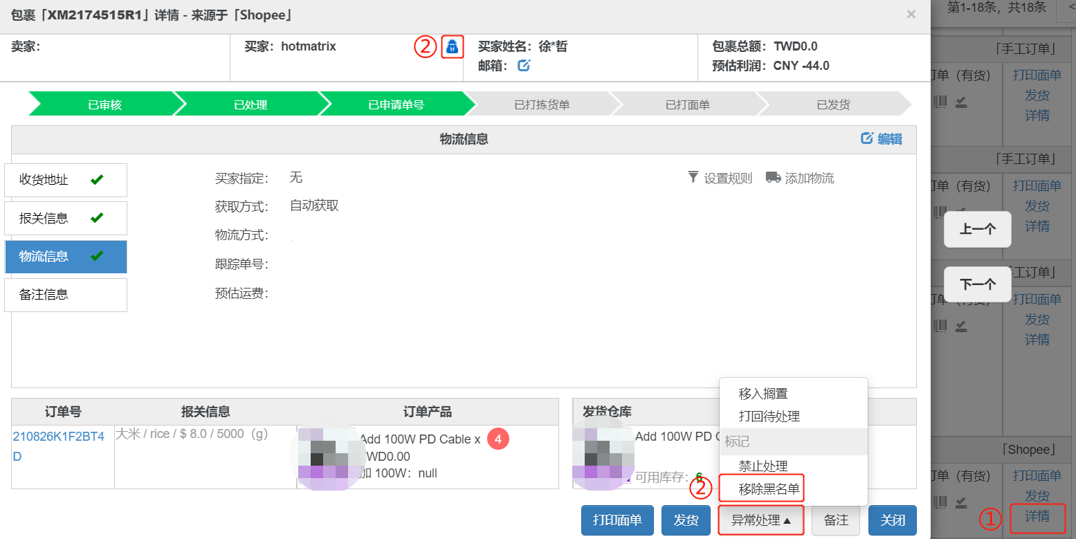 Method 2: [Order details—Exception handling—Remove the blacklist]