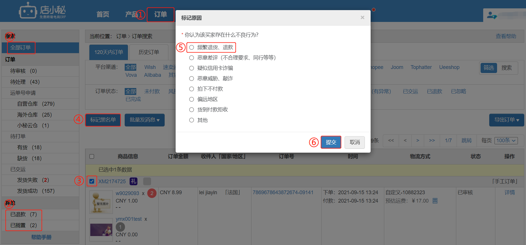 Method 1: [All orders/Refunded/Shelved—check the order—mark the blacklist—select the reason—OK]