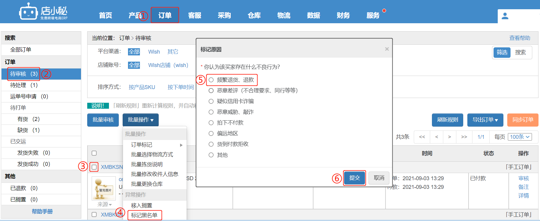 Method 2: [pending review—check the order—bulk Operation—Mark blacklist—Select reason—OK] To