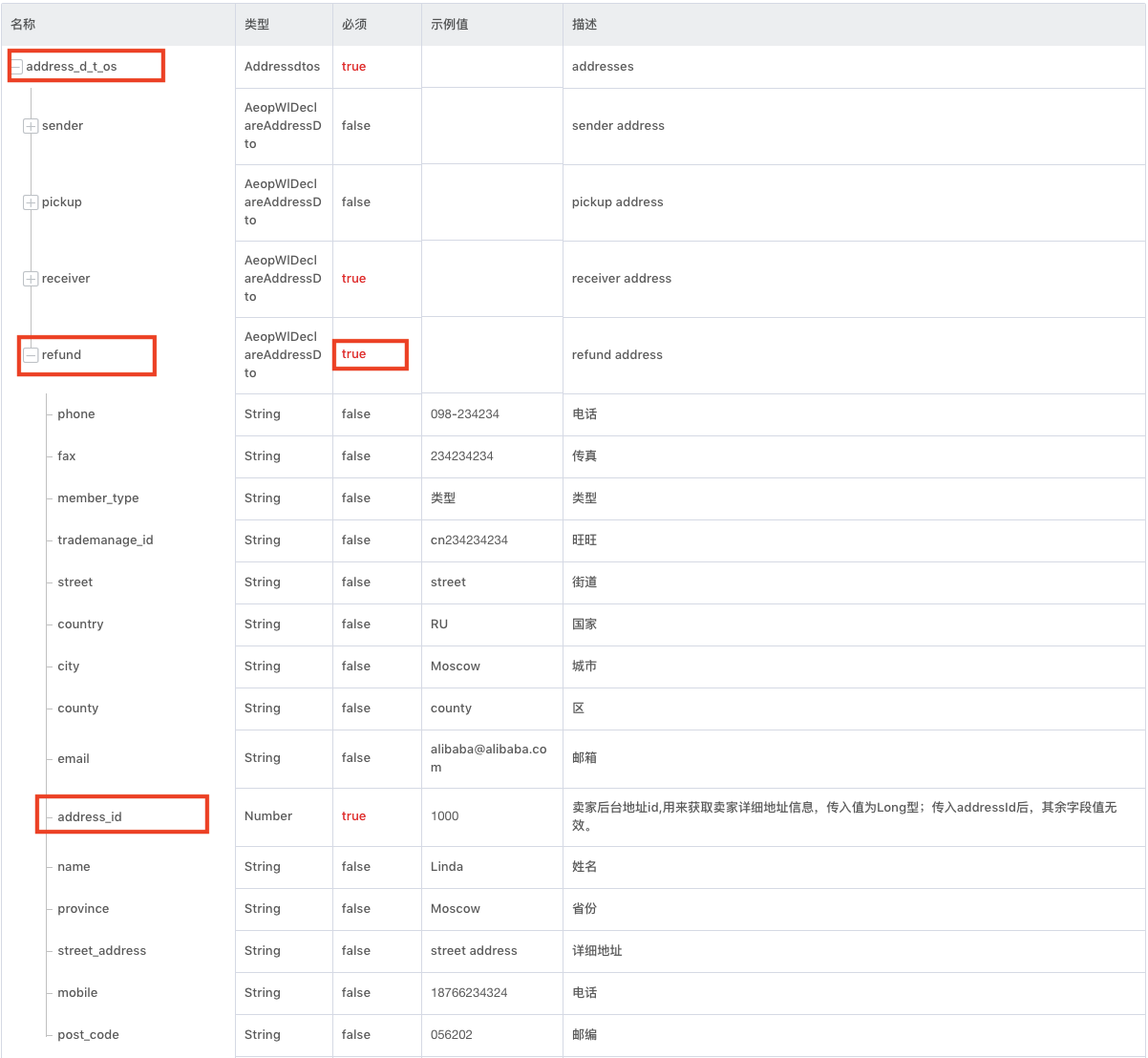 The “address_d_t_os” -> “refund” in API aliexpress.logistics.createwarehouseorder will be mandatory. Inside it, “address_id” is mandatory while others are not required.