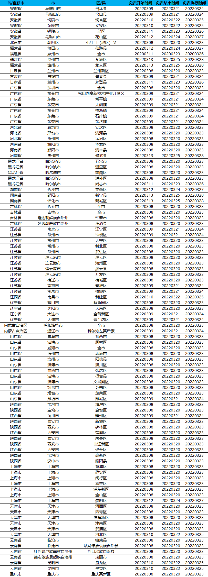 3. Scope of exempted areas: According to the "National Medium and High Risk Level Areas" ( http://bmfw.www.gov.cn/yqfxdjcx/risk.html ) announced on the official website of the State Council, combined with the statistics of areas that cannot be collected by logistics service providers.