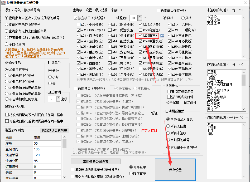 Enter the "Advanced Settings" of the express batch query master, check the "SF Express" interface, and remember to save the settings.